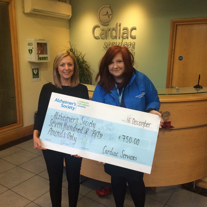 Cardiac Services NI have a chosen two local charities to receive Christmas donations, Tiny Life and the Alzheimer's Society NI. Pictured is Elaine Devlin from Cardiac Services presenting a cheque to Laura from The Alzheimer's Society NI.